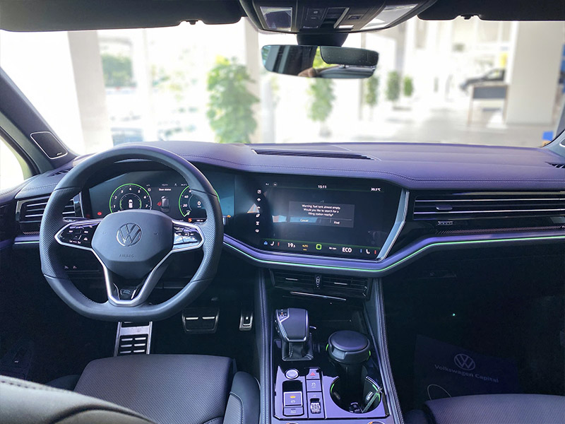 Bước vào bên trong, Touareg R-Line chào đón người dùng bằng một không gian nội thất đẳng cấp, nơi công nghệ và sự tiện nghi được đặt lên hàng đầu, xóa bỏ gần như hoàn toàn các nút bấm vật lý truyền thống.